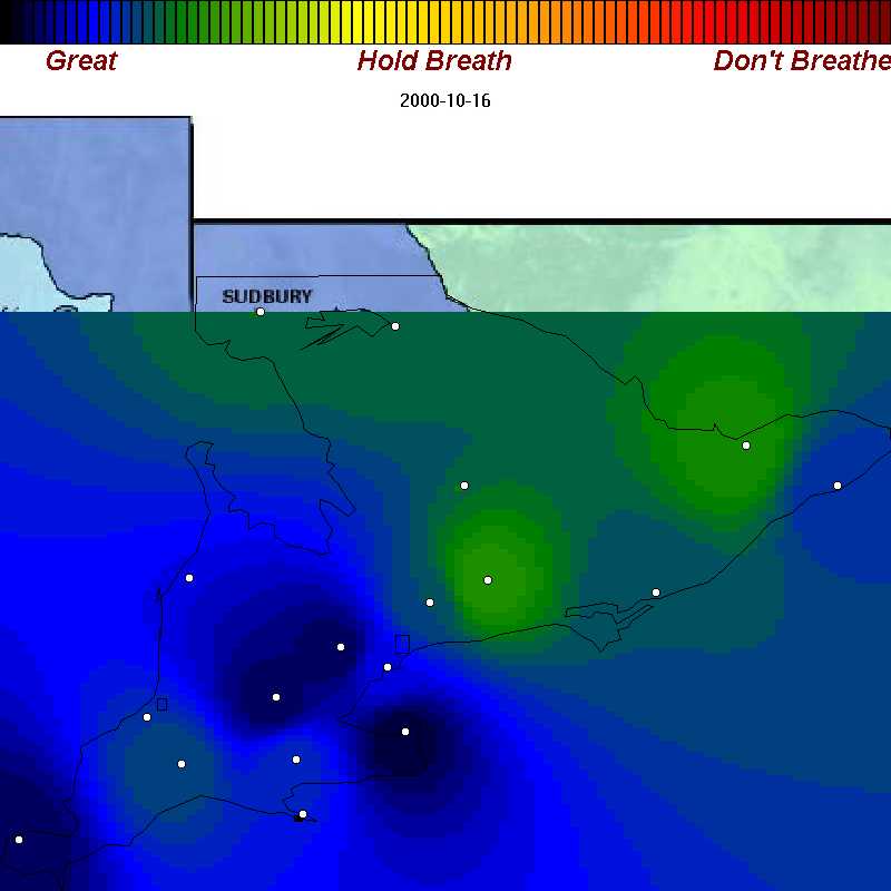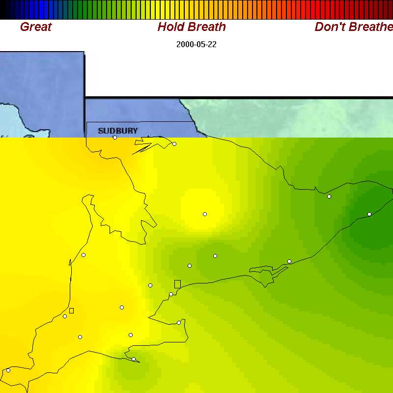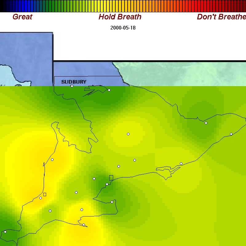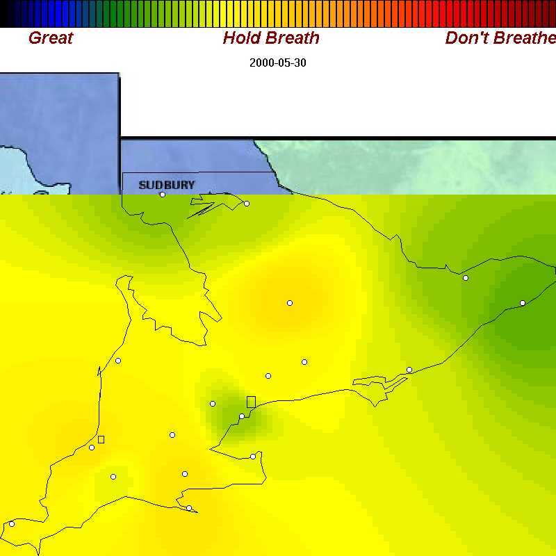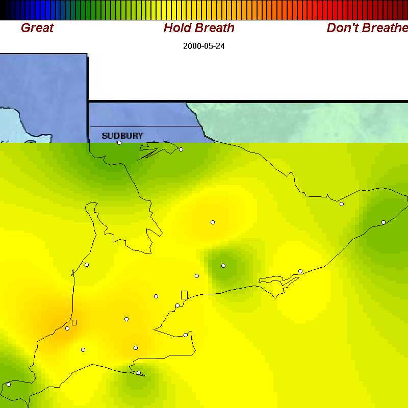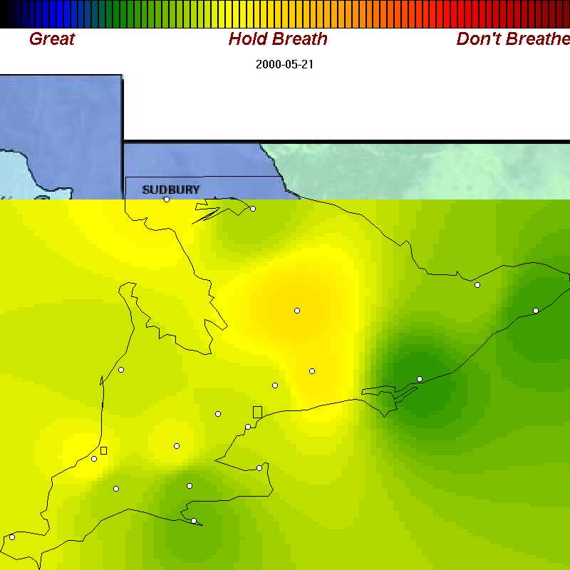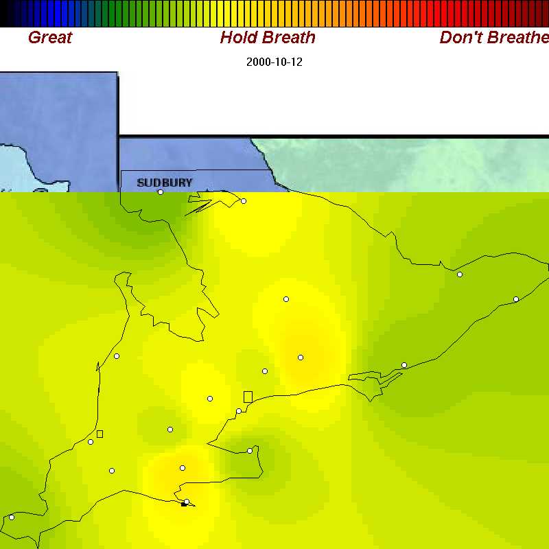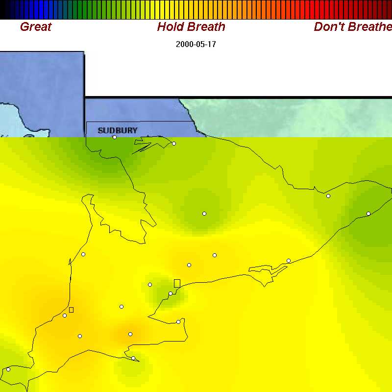 We've recorded example of good, poor, and bad air days throughout spring, summer, and fall of 2000 in Ontario. Each map is about 42 KB. We've purposely omitted many days with good air quality so the sample you see below is oriented towards showing you the worst.