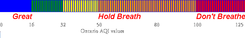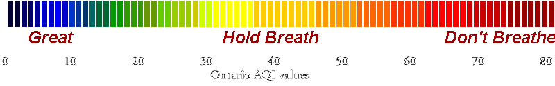 Note: this is a different range of color values from those used by the Ontario government or the EPA. Our range is similar to the government scheme at low pollution levels, but shows more details during high pollution episodes. We based our scale on abundant medical and epidemiological data showing that health is effected for many people at levels below the provincial standard. The Ontario government's scheme is shown below: