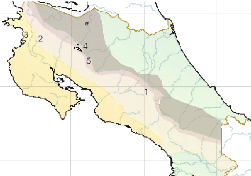 This map shows where we went. Most travellers in the past have gone to San Jose (1), in the central highlands, but our flight took us to the new international airport near Liberia (2) in Guanacaste Province, the "cowboy country" of Costa Rica. We stayed on the Pacific near Playa Panama (3), and travelled inland to Arenal Volcano (4) and the Monteverde Cloud Forest Preserve (5).